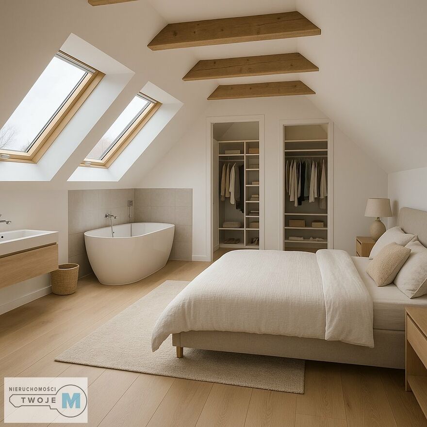 Poddasze domu to zaciszna część nocna. W jej skład wchodzą trzy ustawne sypialnie, każda z wyjściem na balkon, a także rodzinna łazienka z miejscem na wannę.