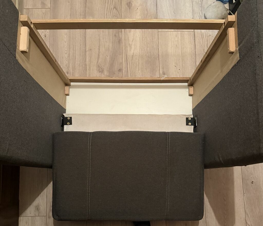 Posiada biały pojemnik na pościel, który wsuwa się po składaniu w fotel.