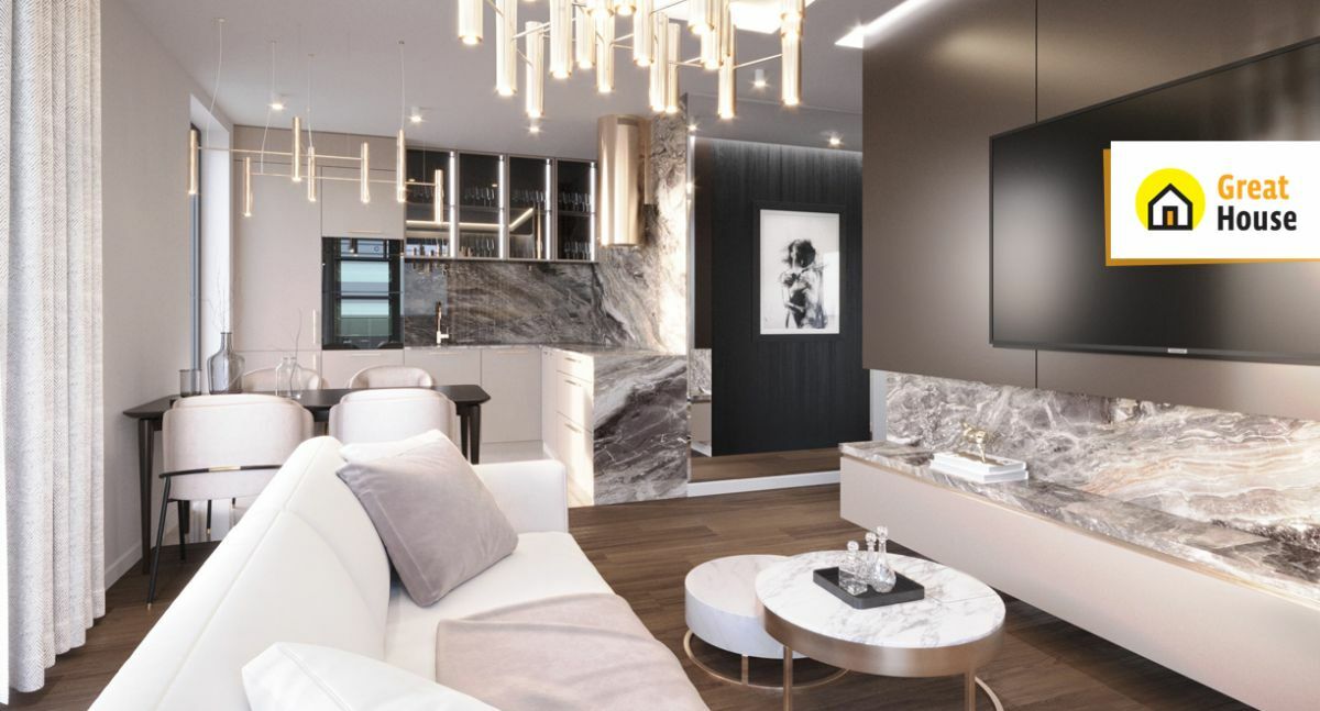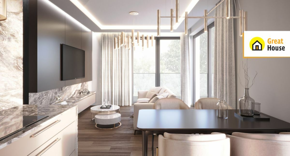 Apartament zaprojektowany zgodnie z filozofią Hygge pozwala na komfortowy odpoczynek, a duże przeszklone tarasy umożliwiają regenerację na świeżym powietrzu.